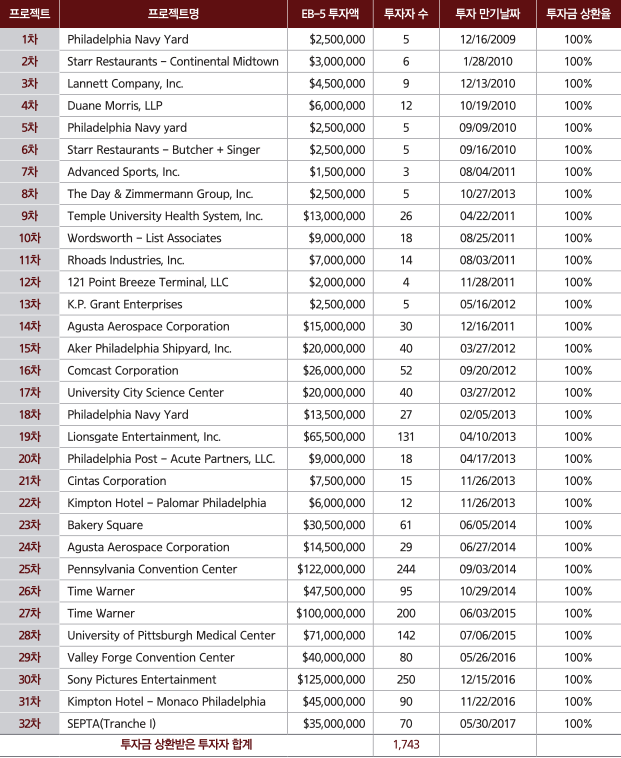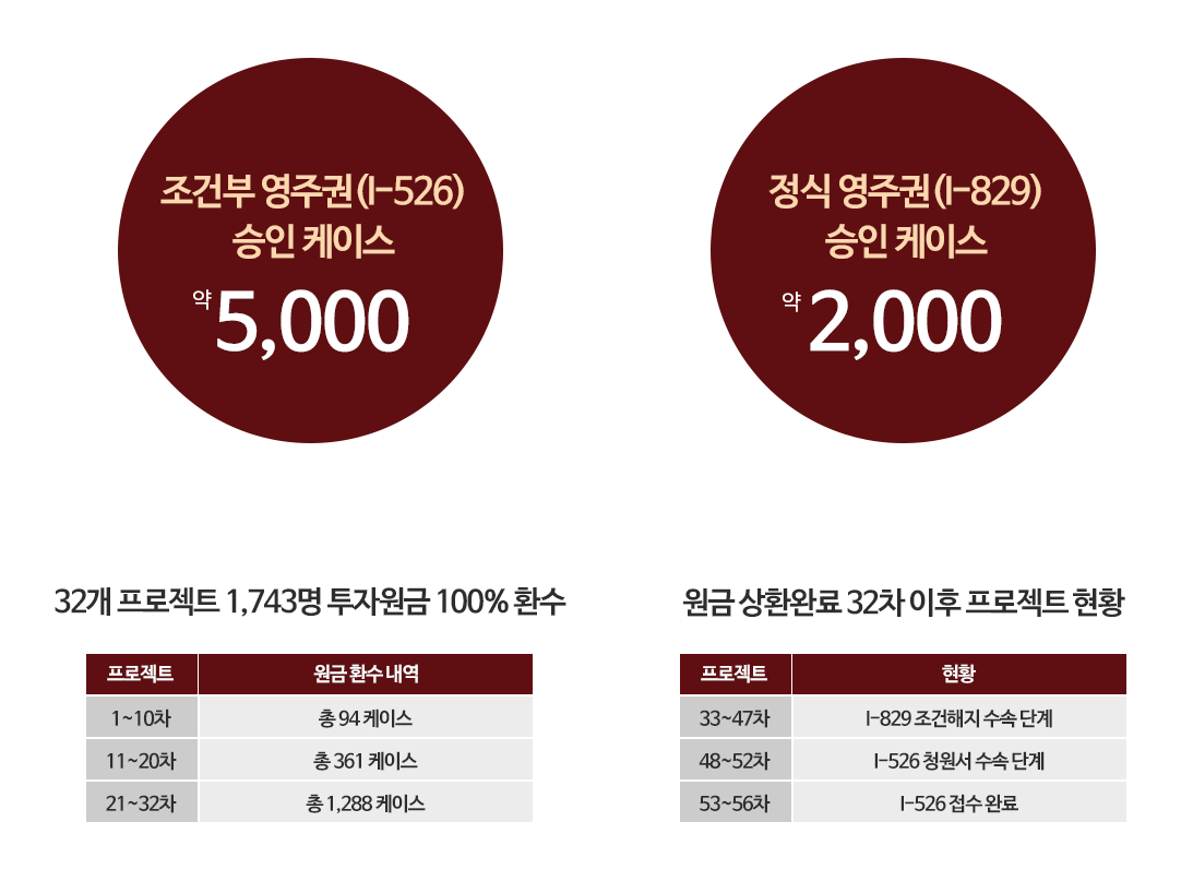 2017년 12월 기준, 총 32개 프로젝트에서 1,743명의 고객들이 투자원금 100% 환수라는 독보적인 실적을 보유하고 있는 세계 최고의 미국 투자이민 전문 기업입니다. 캔암은 신뢰와 신임을 기반한 명성으로, 각 고객들에게 EB-5 투자이민의 모든 절차부터 영주권 취득까지 이르는 종합적인 서비스를 제공합니다. 캔암은 현재 이민국으로부터 7개의 리저널 센터 (필라델피아, 펜실베니아, 로스앤젤레스, 하와이 및 뉴욕 등)를 승인 받아 운영하고 있습니다.