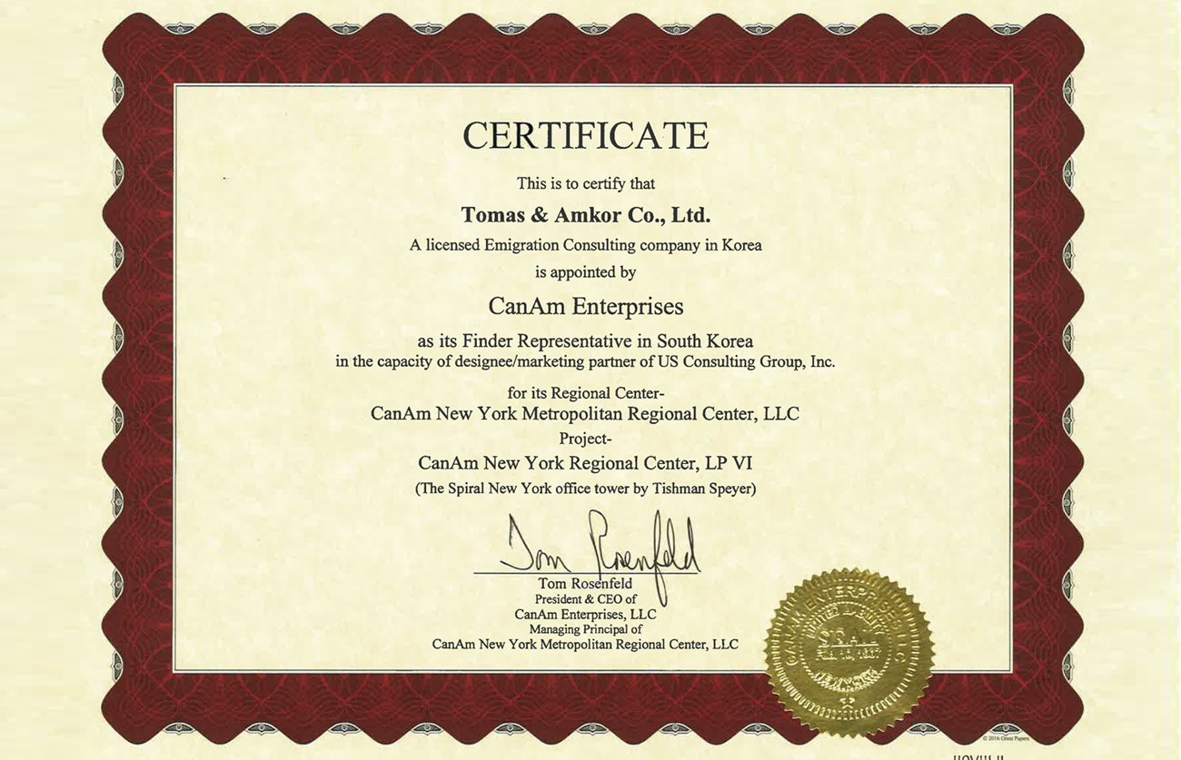 캔암엔터프라이즈(CanAm Enterprises, LLC, “캔암”)는 지난 25년간 투자이민과 관련하여 민간 및 정부지원 투자이민 프로그램을 운영 및 관리하였습니다. 1987년도에 설립된 캔암은 본 미국 투자이민 프로그램과 유사한 구조의 캐나다 주정부 투자이민 프로그램 (Canadian Business Immigrant Investor Program, BIIP)을 약 20년에 걸쳐 운영한 경력이 있습니다.